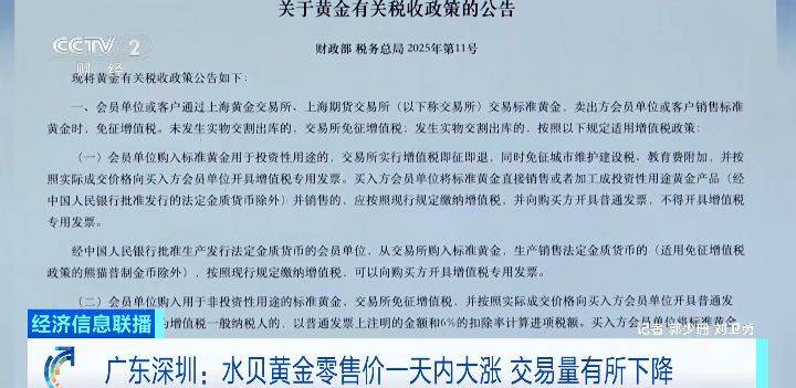 (央视财经《经济信息联播》)上周六(11月1日),财政部、税务总局联合发布黄金税收新政,受新政影响,在中国最大的黄金批发市场——深圳水贝,黄金零售价已经出现了明显变化,来看记者今天的探访。