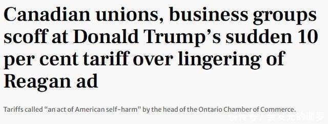 加拿大零部件制造商协会主席Flavio Volpe愤怒批评:“美国总统仅仅因为一条在世界大赛期间播放的广告,就准备让美国人民付出数十亿美元的代价?美国的权力制衡机制去哪了?”加拿大商会和安省商会也批评特朗普,称此举会伤害美国自身利益:“加拿大没有向他屈服,他就拿安省的广告当借口加倍施压。特朗普说得越多,越证明广告说的是真相:关税政策是美国的自残行为。”