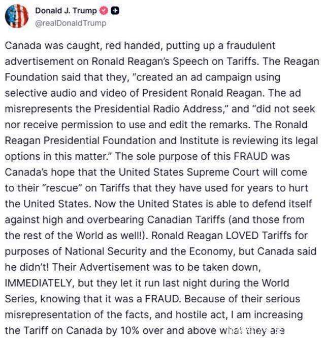 安省政府本月早些时候推出了一项价值7500万加元的宣传活动,其中有一则电视广告引用了美国前总统罗纳德·里根的讲话,公开批评美国的关税政策。问题是,这条广告不仅在加拿大播放,还选择在美国的黄金时段——世界大赛期间播放,直接引发了特朗普的怒火。