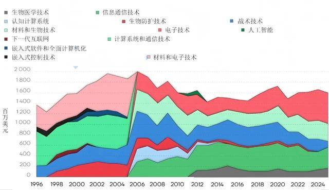 近20年DARPA机密预算变化。2025财年,包含美国国家安全敏感信息项目的机密部分预算约10亿美元,占预算总额的22.9%,为2005年以来最高水平,与2005年相比增长97%。其中,69%用于网络中心战技术,另外各15.5%用于指挥、控制、通信系统以及传感器技术两个领域。近6年内,上述三个领域的预算分别增长了140%、69%、59%。