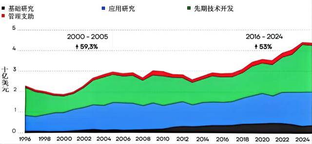 近30年DARPA总预算变化。DARPA总预算近30年来持续增加,从1996财年的22.7亿美元增至2025财年的43.7亿美元,增幅达92.5%,年均增长率3.2%。从2025财年DARPA经费投量看,基础研究占比为9.22%,远高于1996财年的3.37%,但总体低于2013—2022财年;应用研究占比为36.51%,为1997财年以来最低;先期技术开发占比达51.35%,为近27年来最高。