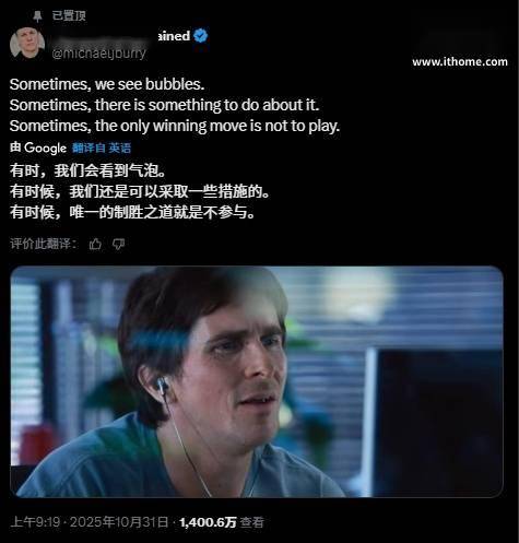 IT之家注意到,上周,伯里在社交媒体平台 X 上发布了一条隐晦的贴文,附上了电影《大空头》(The Big Short)中自己角色的图片,并警告称“有时候,我们确实能看到泡沫”。周一晚间,他又在个人账户上发布了一系列图片,其中包括彭博新闻一篇关于英伟达等公司“循环融资”问题报道的图表。