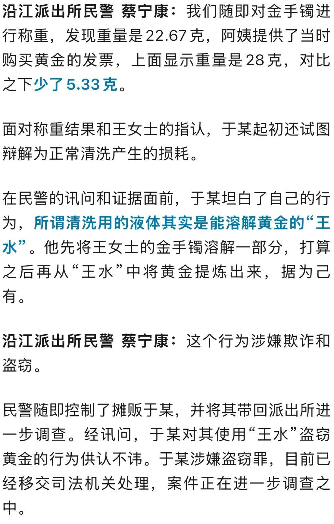 王女士说,在拿到金手镯敲圆后,于某将其加热放入某种液体中浸泡了十几秒,说该步骤是为了清洗手镯,之后就把手镯还给了自己。在离开市场后,王女士发现金手镯戴在手上变软变轻了不少,怀疑是于某“动了手脚”,王女士便和女儿一起报警求助。