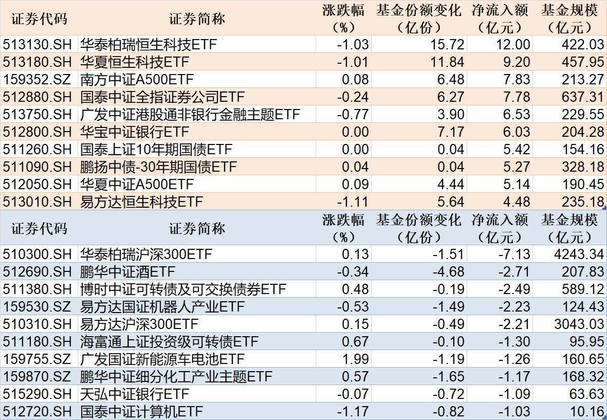 与此同时,华泰柏瑞沪深300ETF基金份额减少1.51亿份,净流出额为7.13亿元;鹏华中证酒ETF基金份额减少4.68亿份,净流出额为2.71亿元;博时中证可转债及可交换债券ETF基金份额减少0.19亿份,净流出额为2.49亿元。