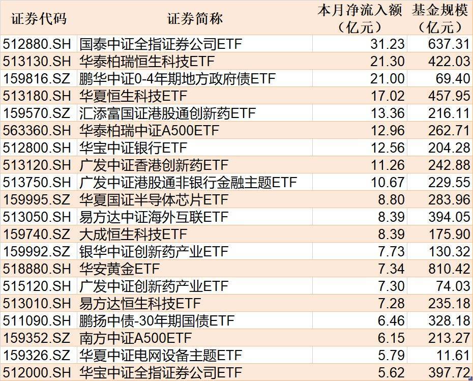 截至11月5日,本月资金净流入额居前20的ETF名单如下: