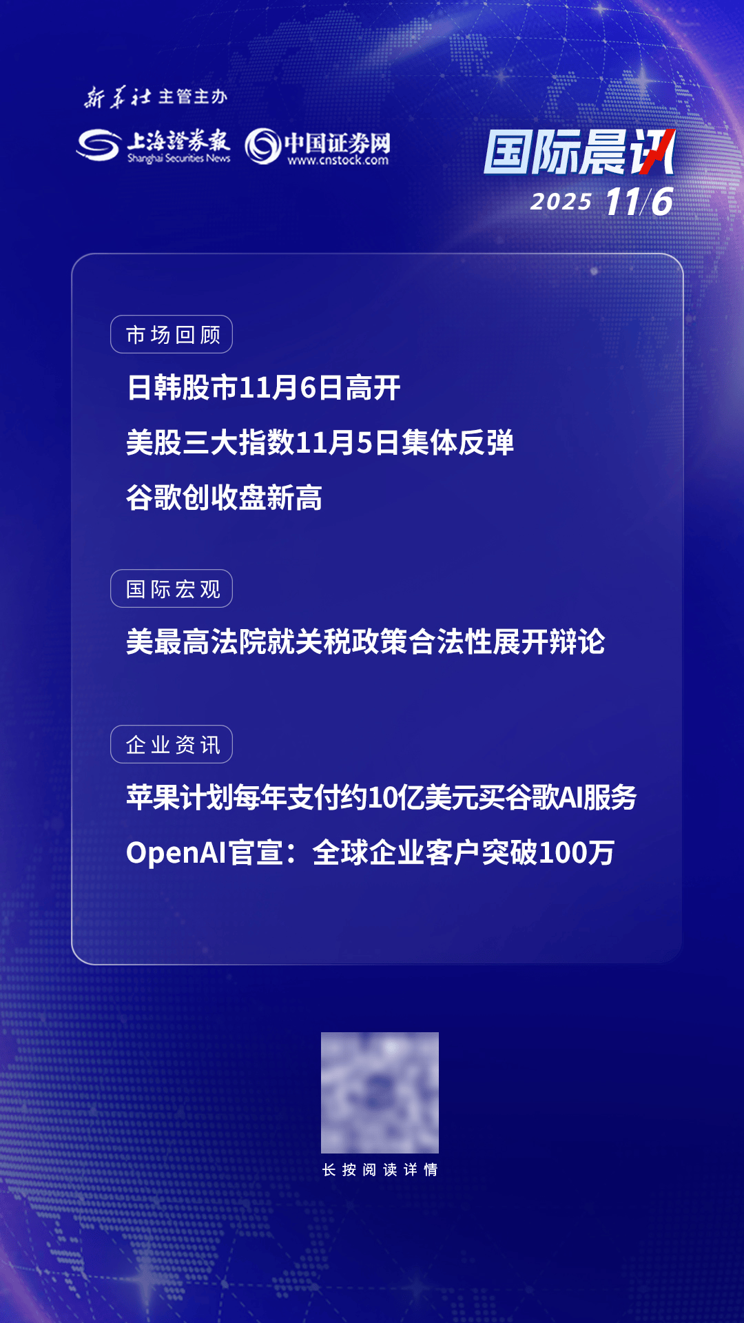 日韩股市11月6日高开;美股三大指数11月5日集体反弹,谷歌创收盘新高;美最高法院就关税政策合法性展开辩论。