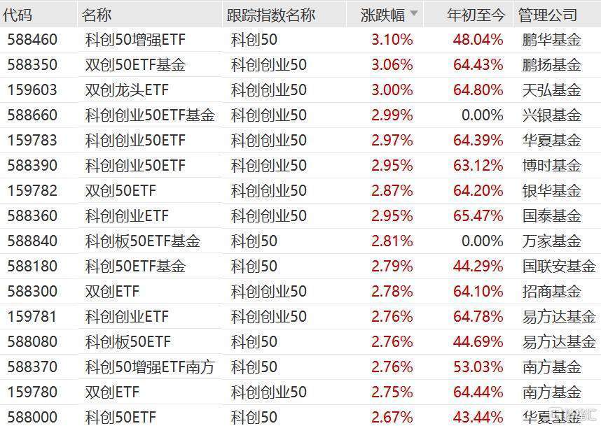 科创50增强ETF、双创龙头ETF涨超3%;科创创业50ETF、双创ETF、科创创业ETF、科创板50ETF、科创50ETF涨超2.6%。