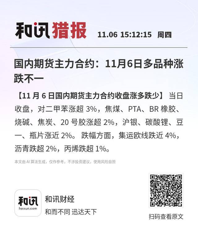 【11 月 6 日国内期货主力合约收盘涨多跌少】当日收盘,对二甲苯涨超 3%,焦煤、PTA、BR 橡胶、烧碱、焦炭、20 号胶涨超 2%,沪银、碳酸锂、豆一、瓶片涨近 2%。 跌幅方面,集运欧线跌近 4%,沥青跌超 2%,丙烯跌超 1%。