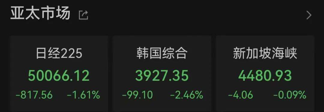 其中,日韩股市跌幅较大,盘中,日经225指数跌约1.6%,韩国综合指数跌幅更是超2.4%。