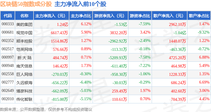 资金流向方面,区块链50(399286)指数成份股当日主力资金净流出合计43.7亿元,游资资金净流入合计9.41亿元,散户资金净流入合计34.3亿元。成份股资金流向详情见下表: