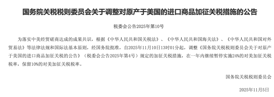 为落实中美经贸磋商达成的成果共识,根据《中华人民共和国关税法》、《中华人民共和国海关法》、《中华人民共和国对外贸易法》等法律法规和国际法基本原则,经国务院批准,自2025年11月10日13时01分起,调整《国务院关税税则委员会关于对原产于美国的进口商品加征关税的公告》(税委会公告2025年第4号)规定的加征关税措施,在一年内继续暂停实施24%的对美加征关税税率,保留10%的对美加征关税税率。