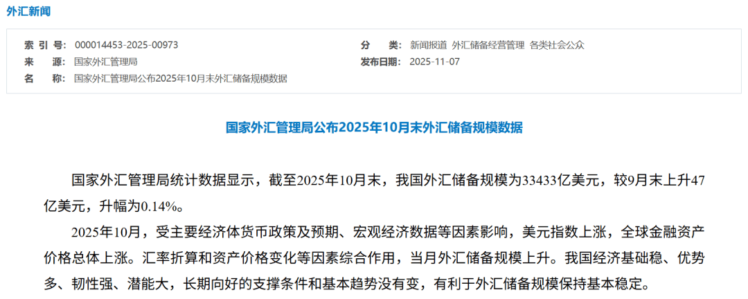 11月7日,国家外汇管理局发布的最新统计数据显示,截至2025年10月末,我国外汇储备规模为33433亿美元,较9月末上升47亿美元,升幅为0.14%。