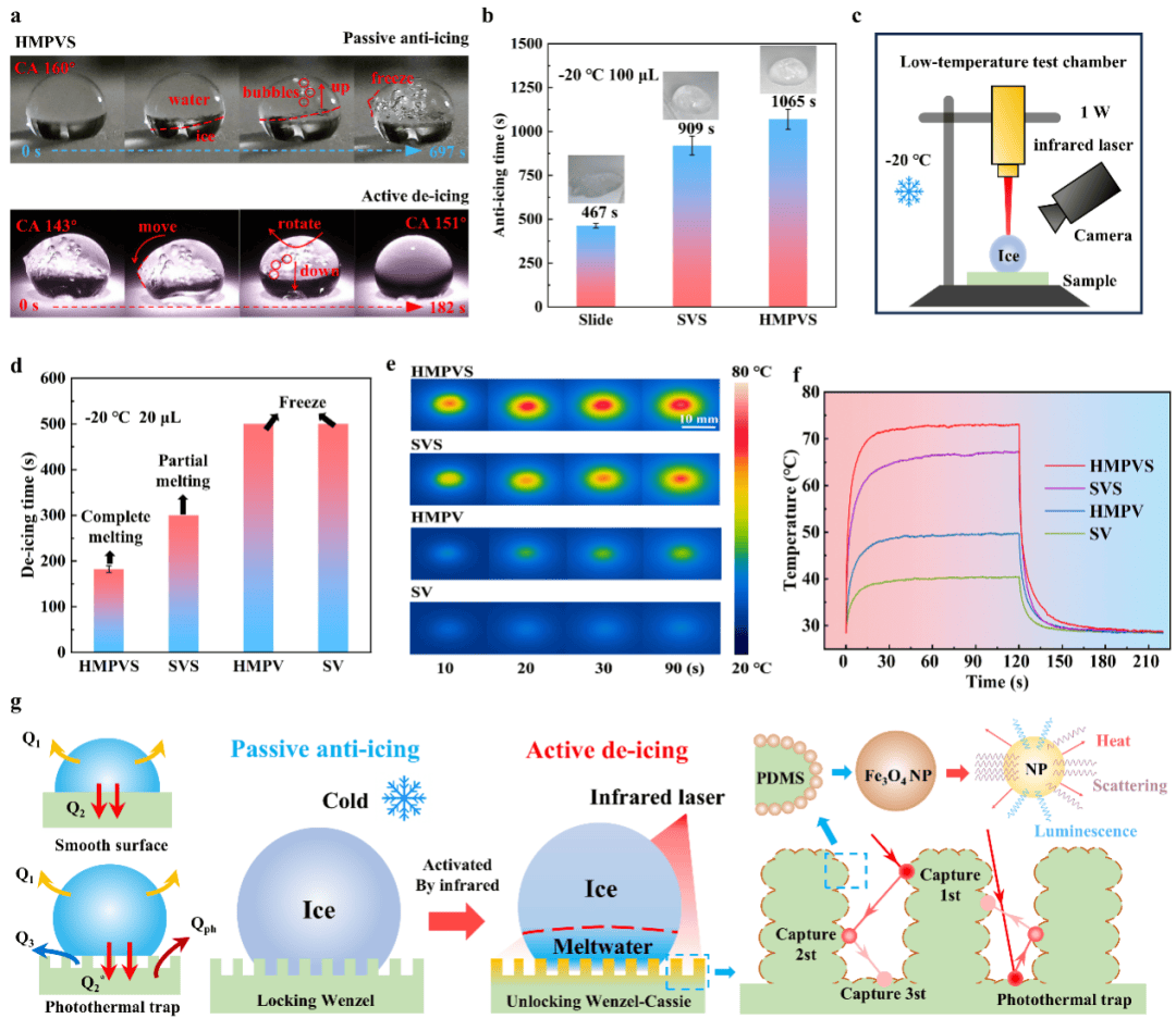 结果表明通过成功构筑由微柱、PDMS沉积物及PDMS/Fe3O4纳米颗粒复合构成的多级微纳结构,可使延迟结冰时间提升约2.14倍。在微柱结构光热阱效应与Fe3O4纳米颗粒的协同作用下,表面光热性能显著增强,最高温度由原始表面的40.3 ℃提升至72.9 ℃,相对提升约78.6%