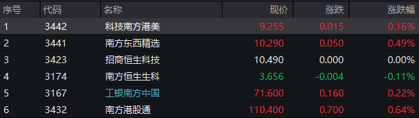 11月10日,港股通ETF扩容正式生效,6只港股上市ETF获新纳入互联互通范围。截至10点50分,南方东英富时东西股票精选ETF(南方东西精选)涨0.49%,南方东英MSCI港股通精选ETF(南方港股通)涨0.64%,工银南方东英标普中国新经济行业ETF(工银南方中国)涨0.22%,南方东英恒生港美科技ETF(科技南方港美)涨0.16%,招商恒生科技指数ETF(招商恒生科技)表现平稳,南方东英恒生生物科技ETF(南方恒生生科)跌0.11%。