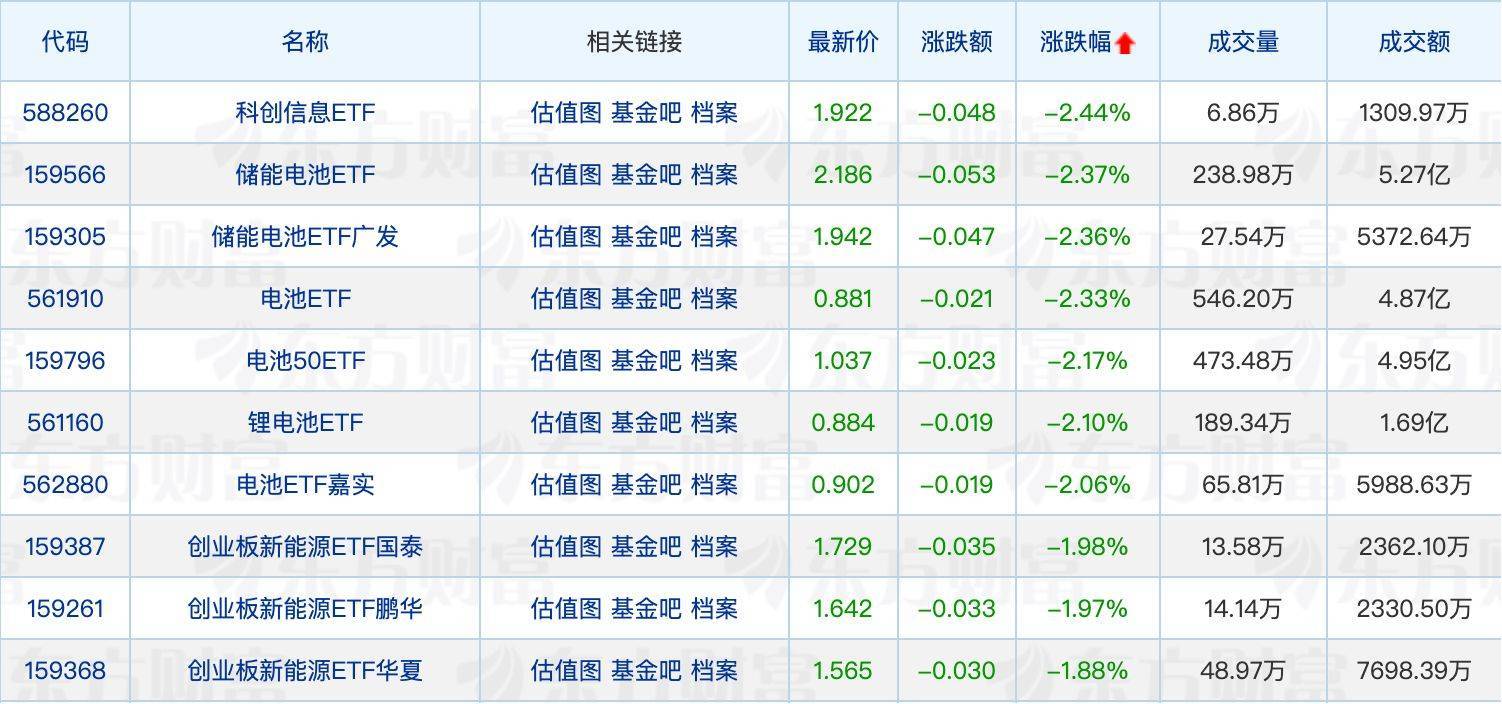 下跌方面,科创信息ETF领跌2.44%,电池相关ETF全线回调。