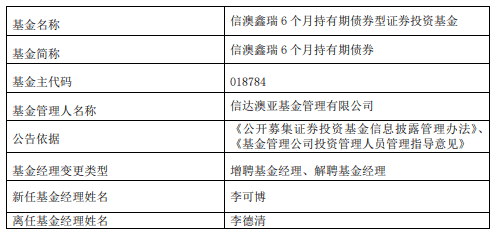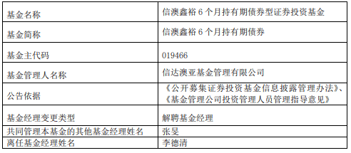 中国经济网北京11月10日讯 近日,信达澳亚基金公告,李德清离任信澳优享债券、信澳新财富混合、信澳恒盛混合、信澳鑫裕6个月持有期债券、信澳稳宁30天滚动持有债券、信澳鑫瑞6个月持有期债券。