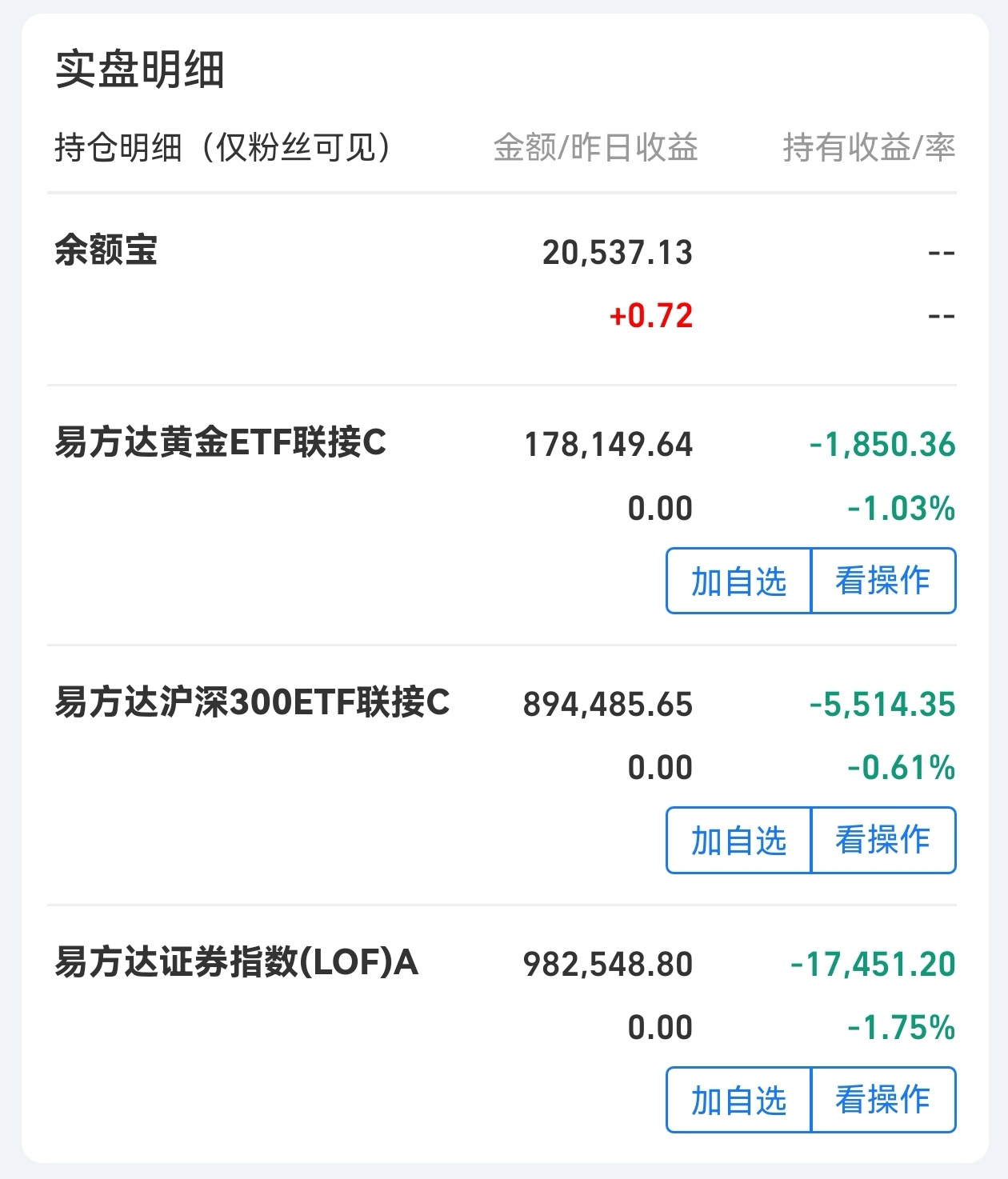 张大仙当前三只核心持仓均为易方达产品,分别是易方达黄金ETF联接C、易方达沪深300ETF联接C、易方达证券指数(LOF)A,持仓金额分别为17.81万元、89.45万元、98.25万元,此外,另有2万元资金放在余额宝。