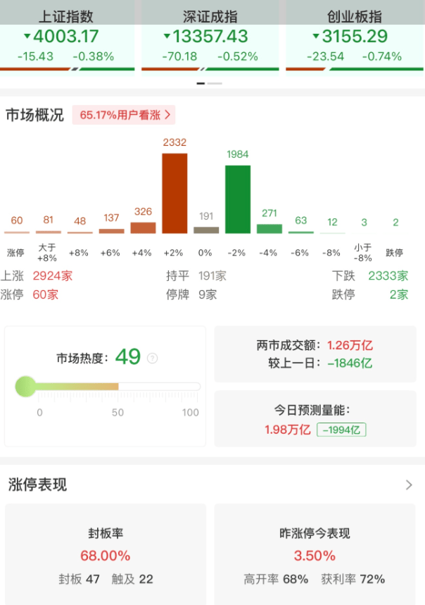 格隆汇11月11日|A股三大指数今日集体调整,截至收盘,上证指数跌0.38%,深证成指跌0.52%,指跌0.74%。沪深京三市全天成交额12680亿元,较上日缩量1864亿元。全市场超2900只个股上涨。板块题材上,培育钻石、光伏设备、电池化工、燃气、医药商业、板块涨幅居前;煤炭开采加工、、白酒、AI语料、算力硬件、证券板块跌幅居前。