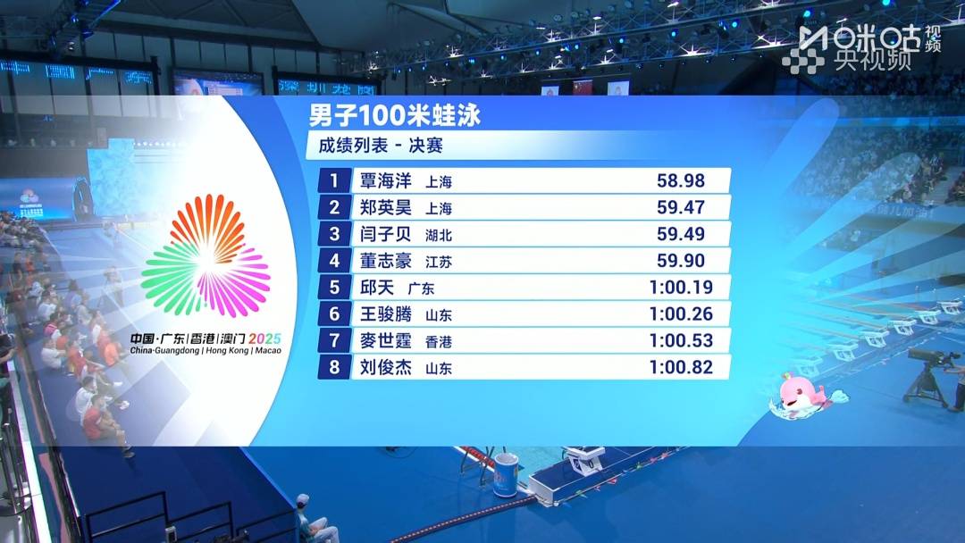 11月11日,据央视新闻消息:刚刚,第十五届全运会男子100米蛙泳决赛,覃海洋代表上海队出战,以58秒98获得冠军,郑英昊获得银牌,闫子贝获得铜牌。