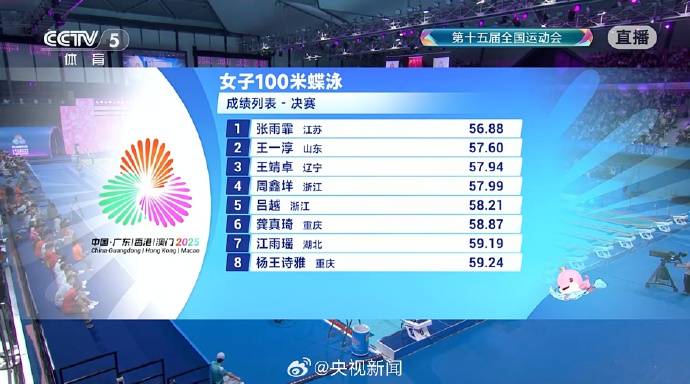 在游泳项目女子100米蝶泳决赛中,江苏队选手张雨霏以56秒88夺得金牌,王一淳获得银牌,王靖卓获得铜牌。