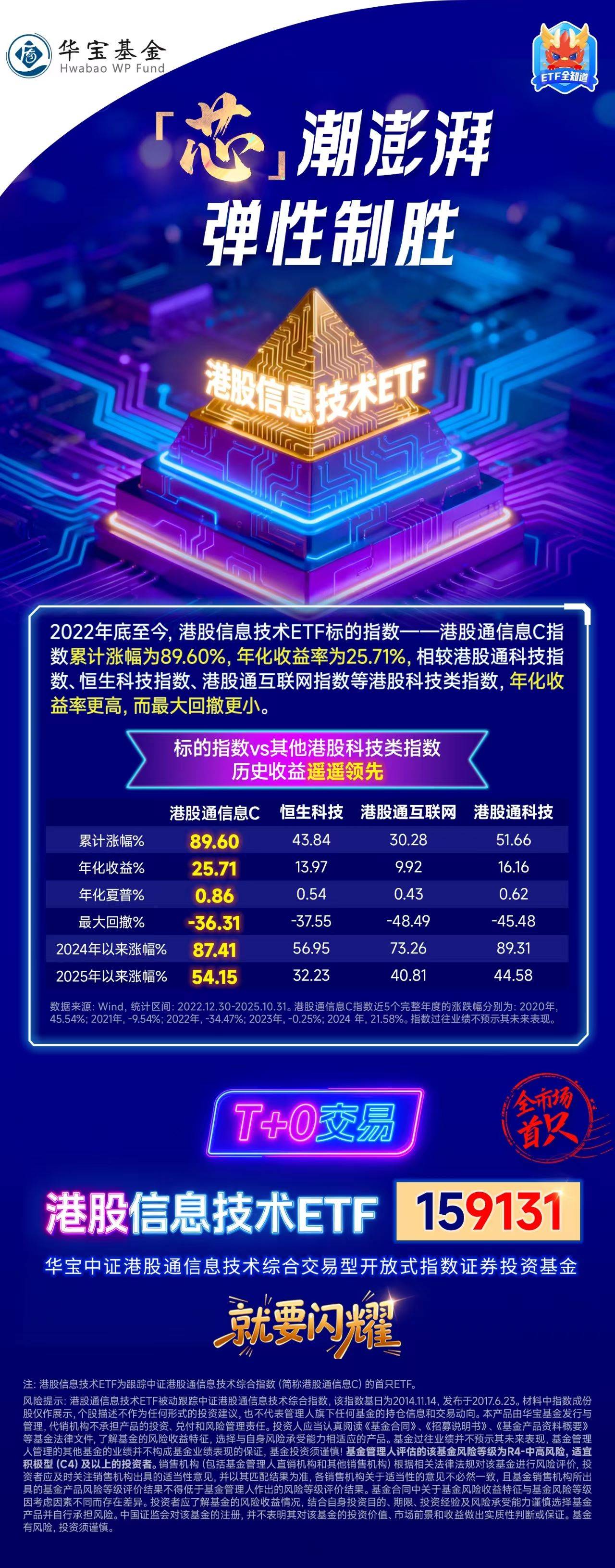 风险提示:港股信息技术ETF被动跟踪中证港股通信息技术综合指数,该指数基日为2014.11.14,发布于2017.6.23, 该指数近5个完整年度的涨跌幅分别为:2020年,45.54%;2021年,-9.54%;2022年,-34.47%;2023年,-0.25%;2024年,21.58%。指数成份股构成根据该指数编制规则适时调整,其回测历史业绩不预示指数未来表现。