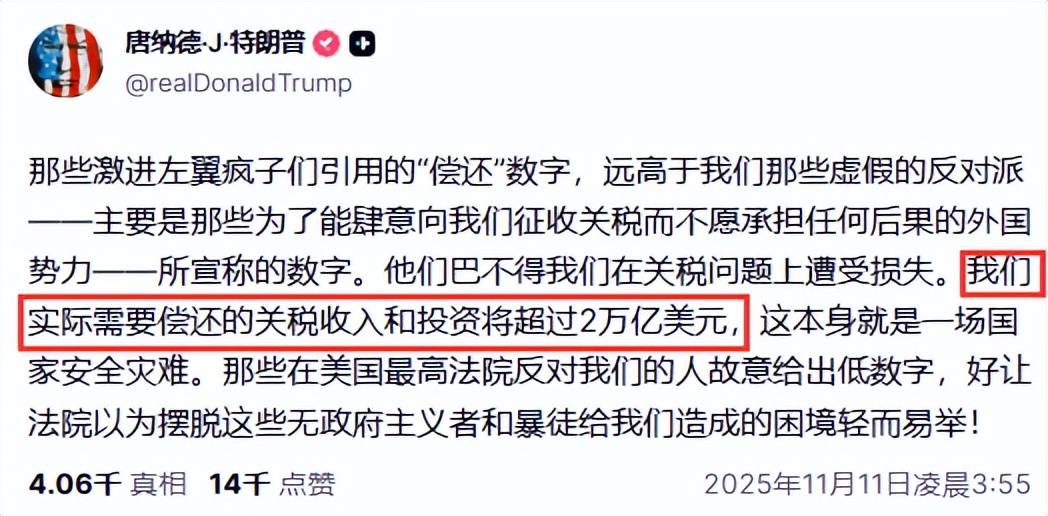 而特朗普所提的“2万亿警告”,不仅仅是经济分析,背后也夹杂着政治动机。他通过制造恐慌,试图影响法院的判决,同时为自己争取更多的政治支持。特朗普甚至提出,关税收入可以用来发放给美国民众,继续塑造自己为“为民争利益”的形象。然而,这种说法既缺乏财政依据,也没有法律支撑。