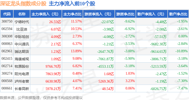 资金流向方面,深证龙头(399653)指数成份股当日主力资金净流入合计38.62亿元,游资资金净流出合计31.78亿元,散户资金净流出合计6.84亿元。成份股资金流向详情见下表: