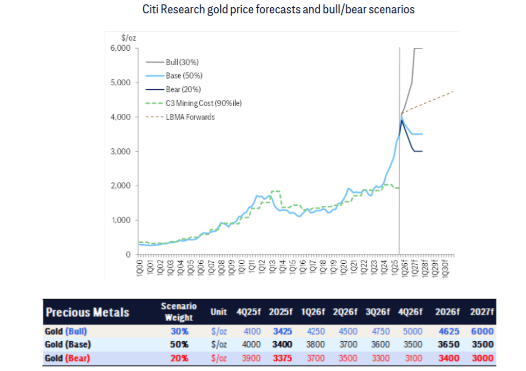在该情景下,花旗预测金价将在2026年底达到5000美元/盎司,并在2027年底触及6000美元/盎司。