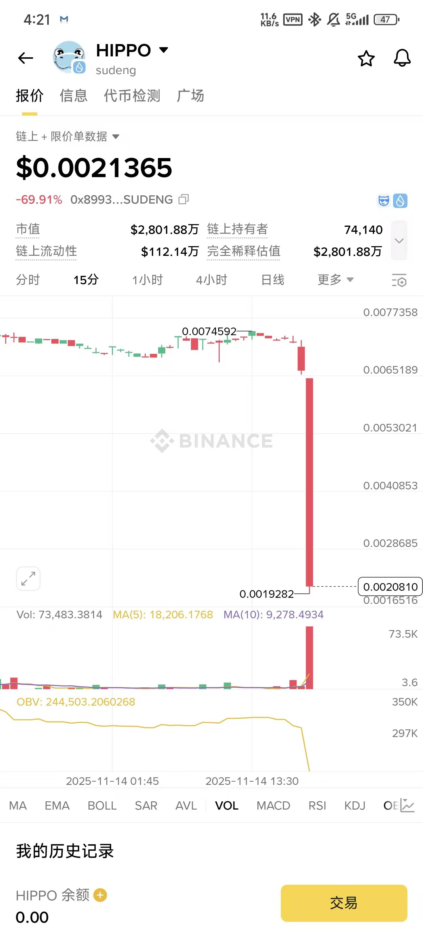 吴说获悉,币安行情数据显示,Binance Alpha 上的 HIPPO 代币今日突遭暴跌,15 分钟内跌幅近 70%,当前报价约 0.0021 美元,市值约 2,801 万美元。HIPPO 是在 SUI 链上的 meme 币,也称为 Sudeng。