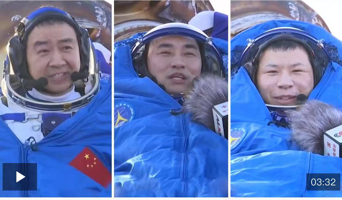 北京时间2025年11月14日16时40分,神舟21号载人飞船返回舱在东风着陆场成功着陆,随后,神舟20号航天员陈冬、陈中瑞、王杰全部平安出舱,踏上了久违的地球家园。