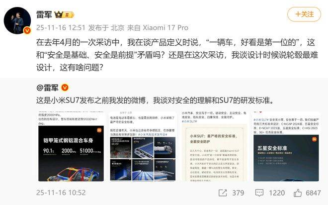 11月16日,小米创办人、董事长兼CEO雷军连发多条微博,重申小米汽车安全标准——安全是基础,安全是前提。
