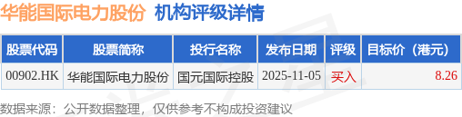 截至2025年11月17日收盘,华能国际电力股份(00902.HK)报收于6.28港元,上涨0.48%,成交量2051.36万股,成交额1.28亿港元。投行对该股的评级以买入为主,近90天内共有1家投行给出买入评级,近90天的目标均价为8.26港元。国元国际控股最新一份研报给予华能国际电力股份买入评级,目标价8.26港元。