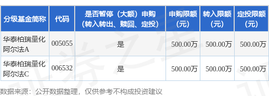 证券之星消息,11月18日华泰柏瑞基金管理有限公司发布《华泰柏瑞量化阿尔法灵活配置混合型证券投资基金限制大额申购(含转换转入、定期定额投资)业务的公告》。公告中提示,为保证本基金的稳定运作,保护基金份额持有人利益,以及根据《华泰柏瑞量化阿尔法灵活配置混合型证券投资基金基金合同》的相关规定,自2025年11月18日起华泰柏瑞量化阿尔法灵活配置混合型证券投资基金限制大额申购(含转换转入、定期定额投资)业务,申购、转换转入上限金额为500.0万元,下属分级基金调整明细如下: