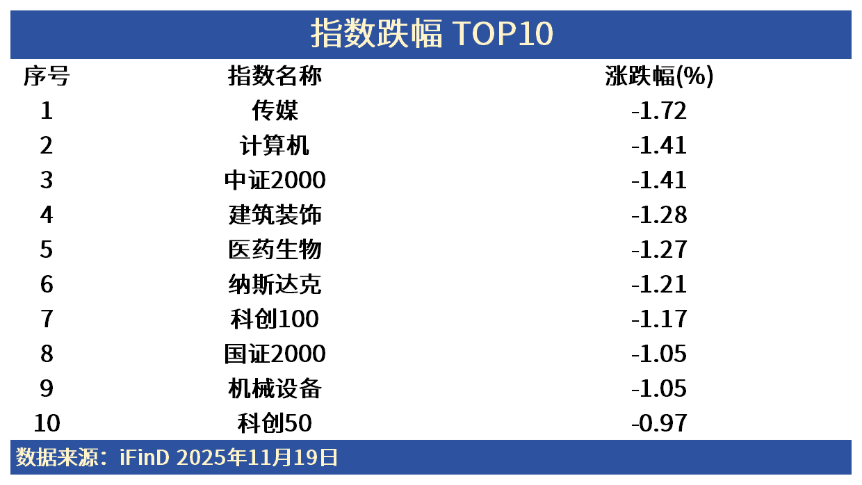 截至2025年11月19日A股收盘,传媒回调1.72%,天下秀、广电网络跌幅居前。纳斯达克回调1.21%。