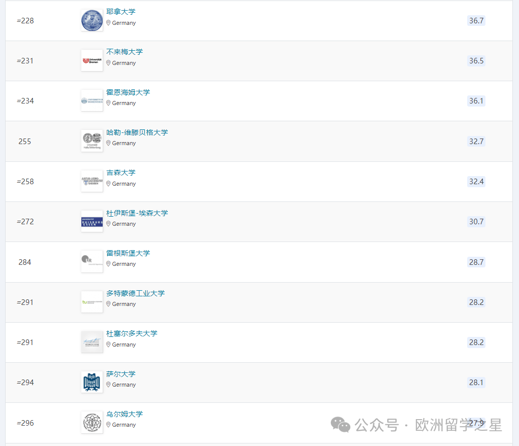 德国有53所大学上榜,16所大学欧洲排名前100,分别是慕尼黑工业大学欧洲排名第11、海德堡大学欧洲排名并列第18、慕尼黑大学欧洲排名第21、柏林自由大学欧洲排名第43、柏林工业大学欧洲排名并列第44、亚琛工业大学欧洲排名第58、卡尔斯鲁厄理工学院欧洲排名第59、柏林洪堡大学欧洲排名第68、弗莱堡大学欧洲排名第76、波恩大学欧洲排名第77、汉堡大学欧洲排名第81、哥廷根大学欧洲排名第82、图宾根大学欧洲排名并列第84、德累斯顿工业大学欧洲排名第93、法兰克福大学欧洲排名并列第98。