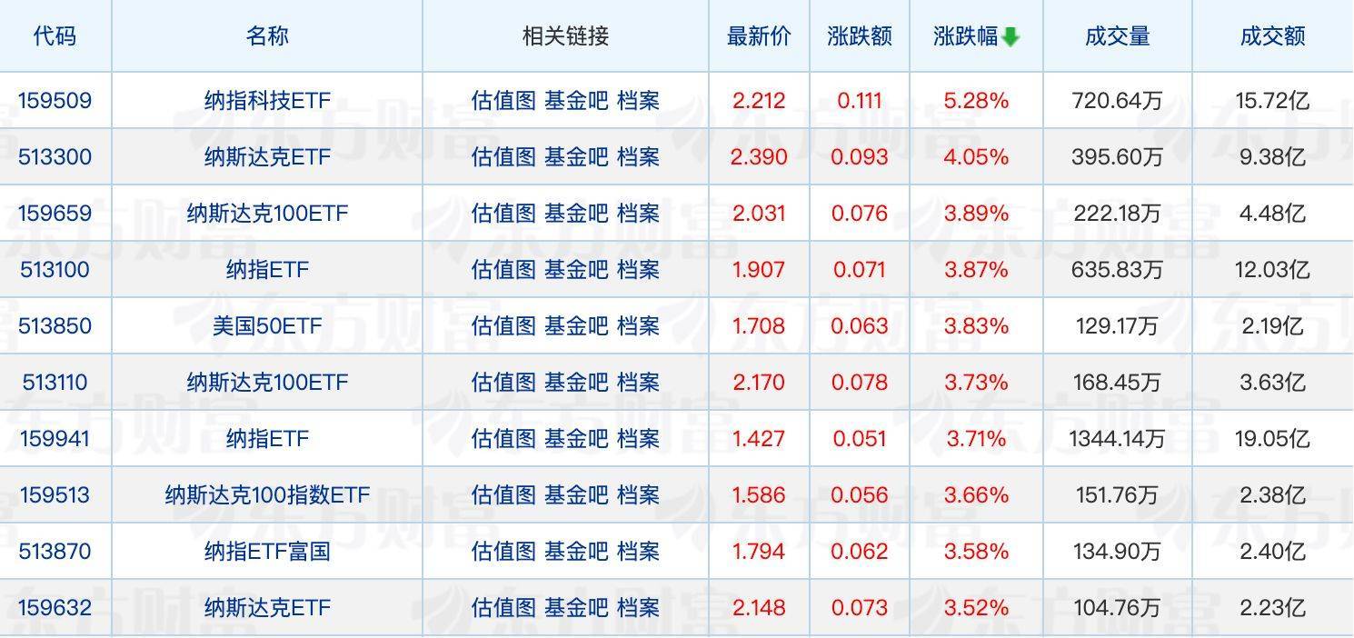 ETF涨跌幅方面,纳指相关ETF涨超4%。