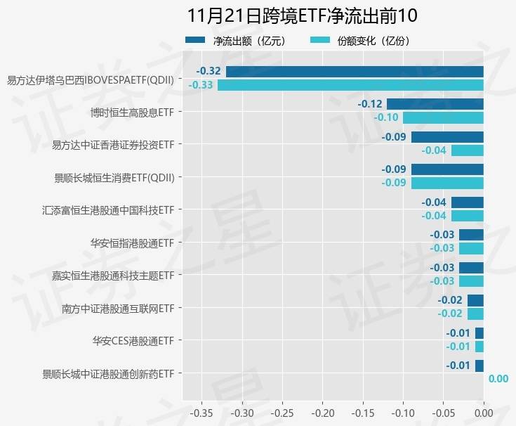 当日有10只跨境ETF基金出现资金净流出,其中净流出排首位的是易方达伊塔乌巴西IBOVESPAETF(QDII)(520870),份额减少了3300.0万份,净流出额为3212.03万元。