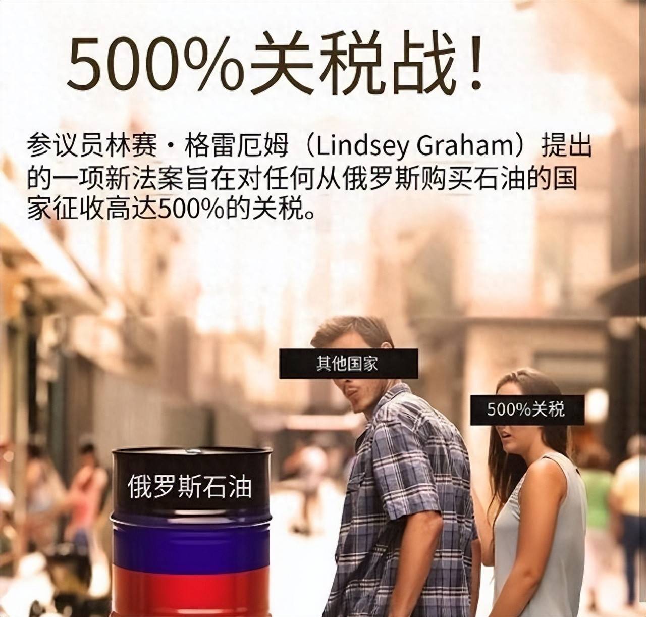 其实这个500%关税的狠招,主要来源是美国那边。美国参议员林赛·格雷厄姆和布卢门撒尔从2025年4月就开始推一个叫“制裁俄罗斯法案2025”的东西,里面明确写了对买俄罗斯石油、天然气、铀的国家,加500%关税进口商品到美国,还能每90天再加500%。
