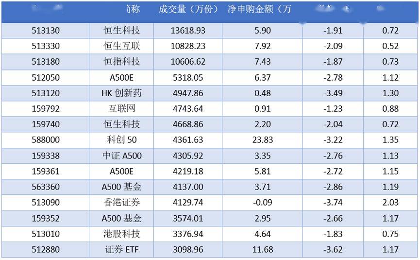 从成交量上来看,2025年11月21日成交量最大的是恒生科技(513130),成交量为13618.93万份。排名靠前的恒生互联(513330)、恒指科技(513180)、A500E (512050),成交量分别为10828.23万份、10606.62万份、5318.05万份。