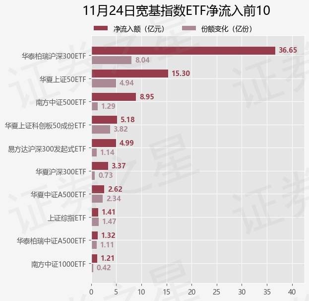 当日有71只宽基指数ETF基金出现资金净流入,其中净流入排首位的是华泰柏瑞沪深300ETF(510300),份额增加了8.04亿份,净流入额为36.65亿元。