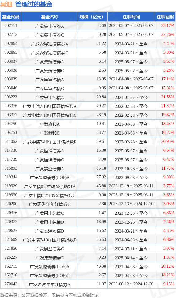 吴迪女士:中国国籍,硕士研究生、硕士、FRM。2014年10月30日加入广发基金管理有限公司,历任金融工程与风险管理部研究员、固定收益管理总部研究员、固定收益管理总部总经理助理。持有中国证券投资基金业从业证书。现任广发基金管理有限公司固定收益管理总部副总经理、广发理财年年红债券型证券投资基金基金经理(自2020年6月12日至2024年12月20日)、广发景丰纯债债券型证券投资基金基金经理(自2021年1月27日起任职)、广发聚源债券型证券投资基金(LOF)基金经理(自2021年4月8日起任职)、广发集富纯债债券型证券投资基金基金经理(自2021年4月8日至2025年5月7日)、广发鑫和灵活配置混合型证券投资基金基金经理(自2021年4月8日起任职)、广发中债7-10年期国开行债券指数证券投资基金基金经理(自2022年2月28日起任职)、广发景益债券型证券投资基金基金经理(自2022年10月26日起任职)、广发汇元纯债定期开放债券型发起式证券投资基金基金经理助理(自2023年6月29日起任职)、广发中债0-2年政策性金融债指数证券投资基金基金经理(自2023年12月19日至2025年3月11日任职)。广发汇佳定期开放债券型发起式证券投资基金的基金经理助理(自2024年2月29日起任职)。广发安泽短债债券型证券投资基金基金经理(自2024年3月21日起任职)、广发集瑞债券型证券投资基金基金经理(自2025年5月7日起任职)。广发恒祥债券型证券投资基金基金经理(自2025年5月7日起任职)。曾任广发集丰债券型证券投资基金基金经理。