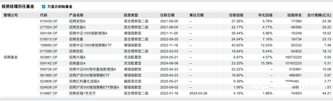 2025年新任职的多只产品因管理时间较短,暂未披露年化收益。其中,4月接手的招商中证500等权重指数增强A任职回报为22.22%,在661只同类产品中排第315;招商沪深300增强策略ETF任职回报为18.60%,排第486;5月任职的偏股混合型产品招商红利量化选股A任职回报为9.39%,在4635只同类产品中排第3598名,处于同类排名均线以下。