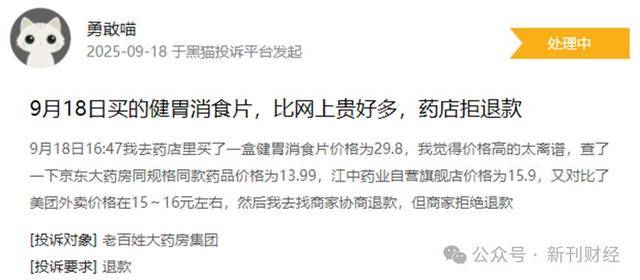 在黑猫投诉平台上,关于老百姓大药房的投诉已有200多起,其中不乏关于药品售价畸高的投诉。一位患者在店员推荐下购买了虫草清肺胶囊,会员价70多,而后发现别家才卖20左右,溢价3倍有余;另一位患者购买的健胃消食片,也比京东大药房和江中自营店的贵了大约1倍。
