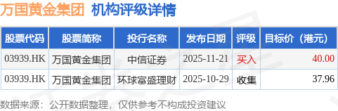 截至2025年11月25日收盘,万国黄金集团(03939.HK)报收于7.96港元,与上一交易日持平,成交量0.0股,成交额0.0港元。投行对该股的评级以收集为主,近90天内共有1家投行给出收集评级,近90天的目标均价为38.98港元。中信证券最新一份研报给予万国黄金集团买入评级,目标价40港元。