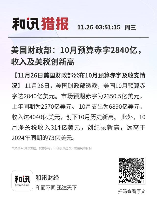 【11月26日美国财政部公布10月预算赤字及收支情况】11月26日,美国财政部透露,美国10月预算赤字达2840亿美元。市场预期赤字为2350.5亿美元,上年同期为2570亿美元。10月支出为6890亿美元,收入达4040亿美元,创下10月历史新高。此外,10月净关税收入314亿美元,创纪录新高,远高于2024年同期的73亿美元。