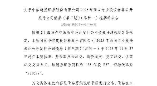 11月26日,上交所发布关于中信建投证券股份有限公司2025年面向专业投资者非公开发行公司债券(第三期)(品种一)挂牌的公告。