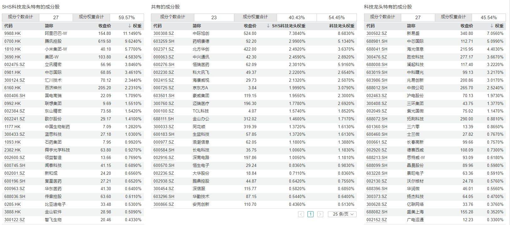 其中,中证沪港深科技龙头指数独有的成分股包括了阿里巴巴-W、腾讯控股等;中证科技龙头指数独有的成分股包括了新易盛、中芯国际等。
