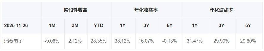 继续对比两个指数的过往表现,从近一年、近三年到近五年,中证消费电子主题指数的收益均好于国证消费电子主题指数,不过中证消费电子主题指数的年化波动率也比国证消费电子主题指数高一些。