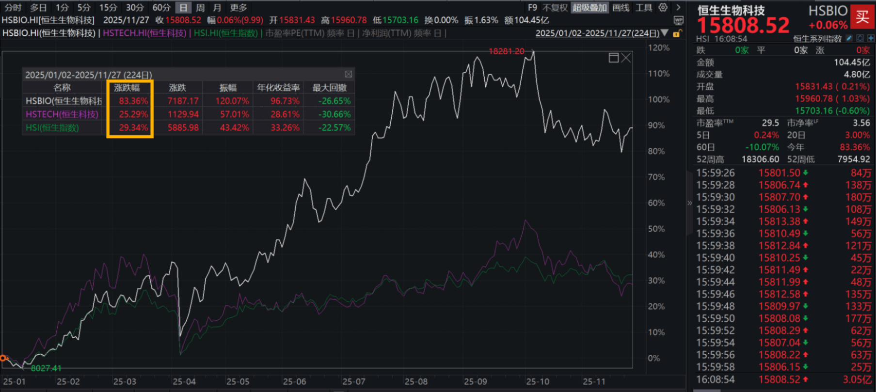 中期趋势看,中信期货认为,恒生生物科技指数已困境反转,有望稳步偏强。该指数年内热度反转变暖,受创新药BD“出海”扩张的提振,年初至今恒生生物科技涨幅83.36%,相较于恒生指数、恒生科技分别有54.02%、58.07%的超额收益,表现强劲。