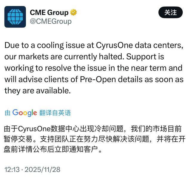 芝商所表示,由于CyrusOne数据中心出现制冷系统故障,目前我们的市场已暂停交易。技术支持团队正全力推进问题尽快解决,开盘前相关安排一经确定将第一时间通知客户。
